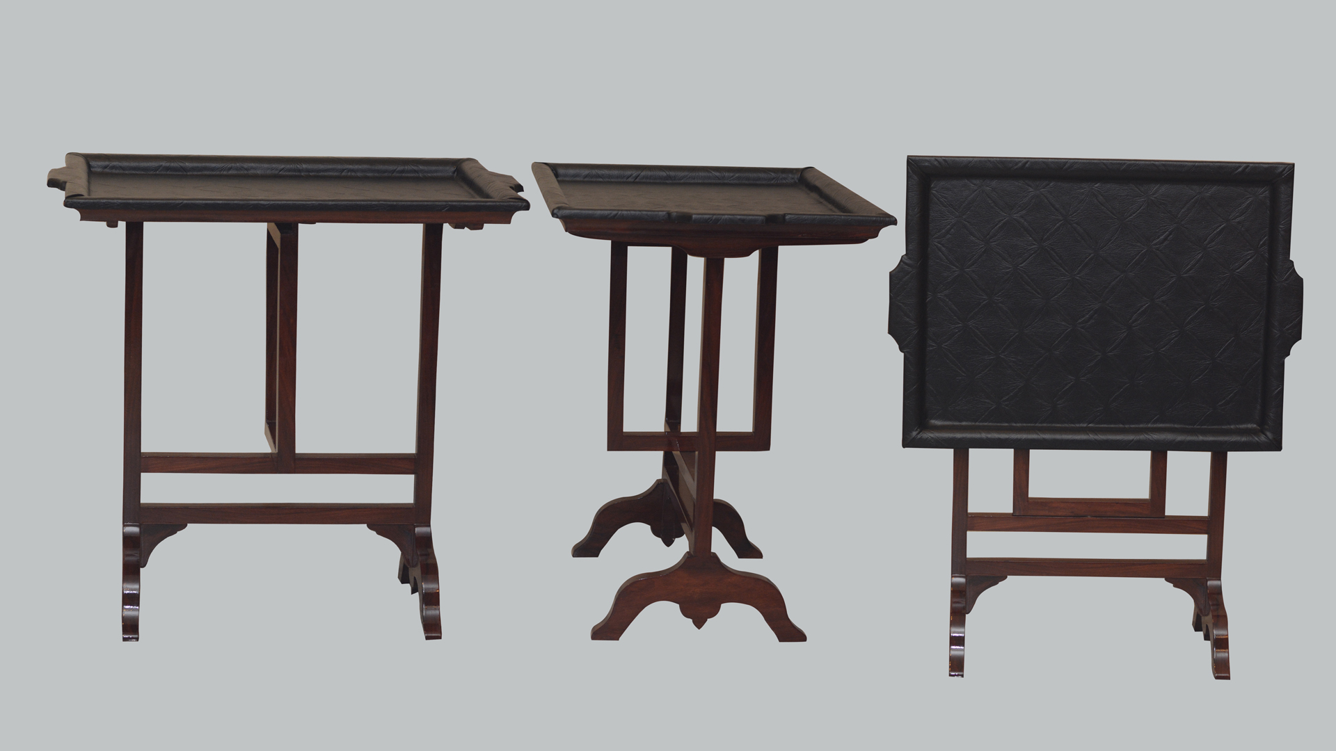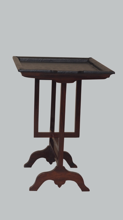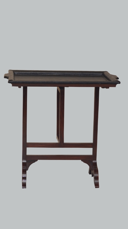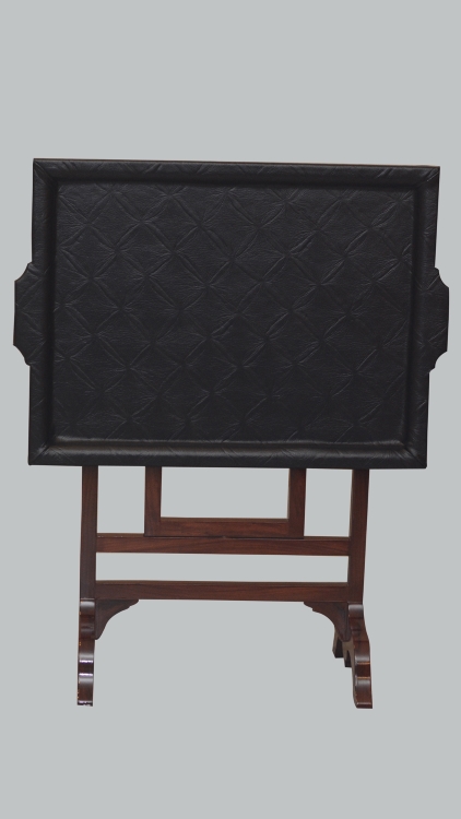 This is a beautiful leather top folding tray . It has a wooden structure in shisham in lovely brown polish with the grains of the wood showing prominently. Beautifully carved to suit your purpose