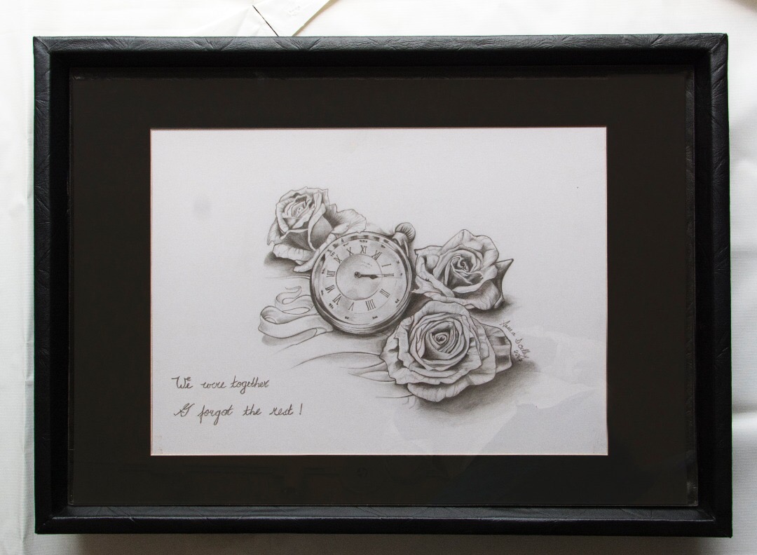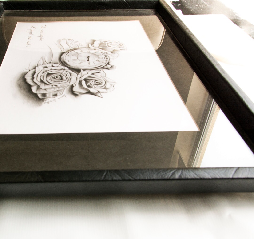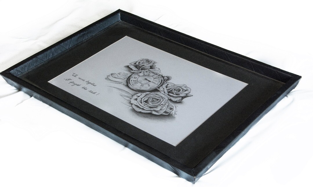 Leather bound 18*26 service tray, Glass top, sketch under glass can be moved to clean . Brass fittings as supports.