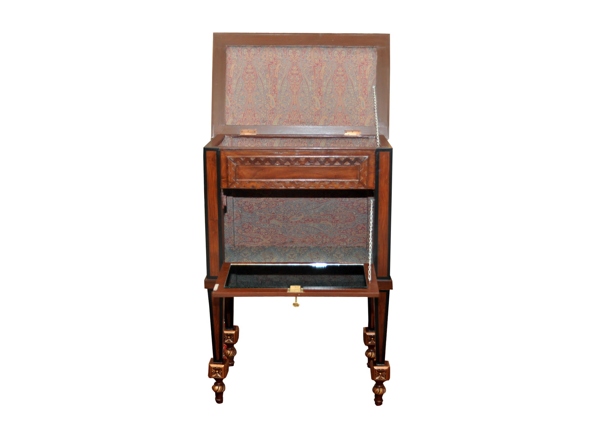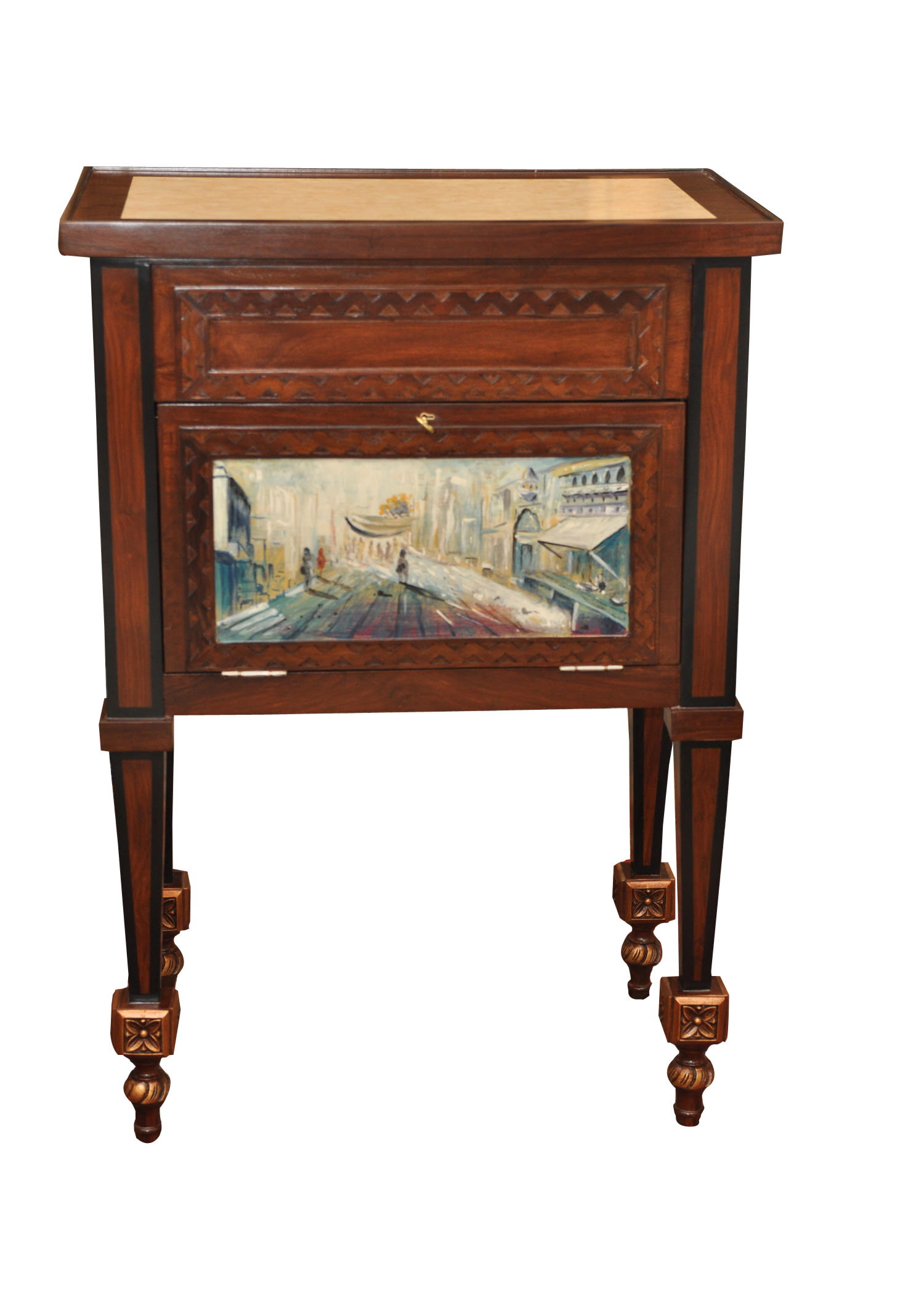 High legged cabinet with a closing top, a lockable Hand-painted door which opens into a storage jamavaar space. Multiple different finishes of wood polished to shisham to create a grand look. Inside the lid is mirror to add depth to the space. Handpainting has been done by a dumb man, to appreciate his talent.