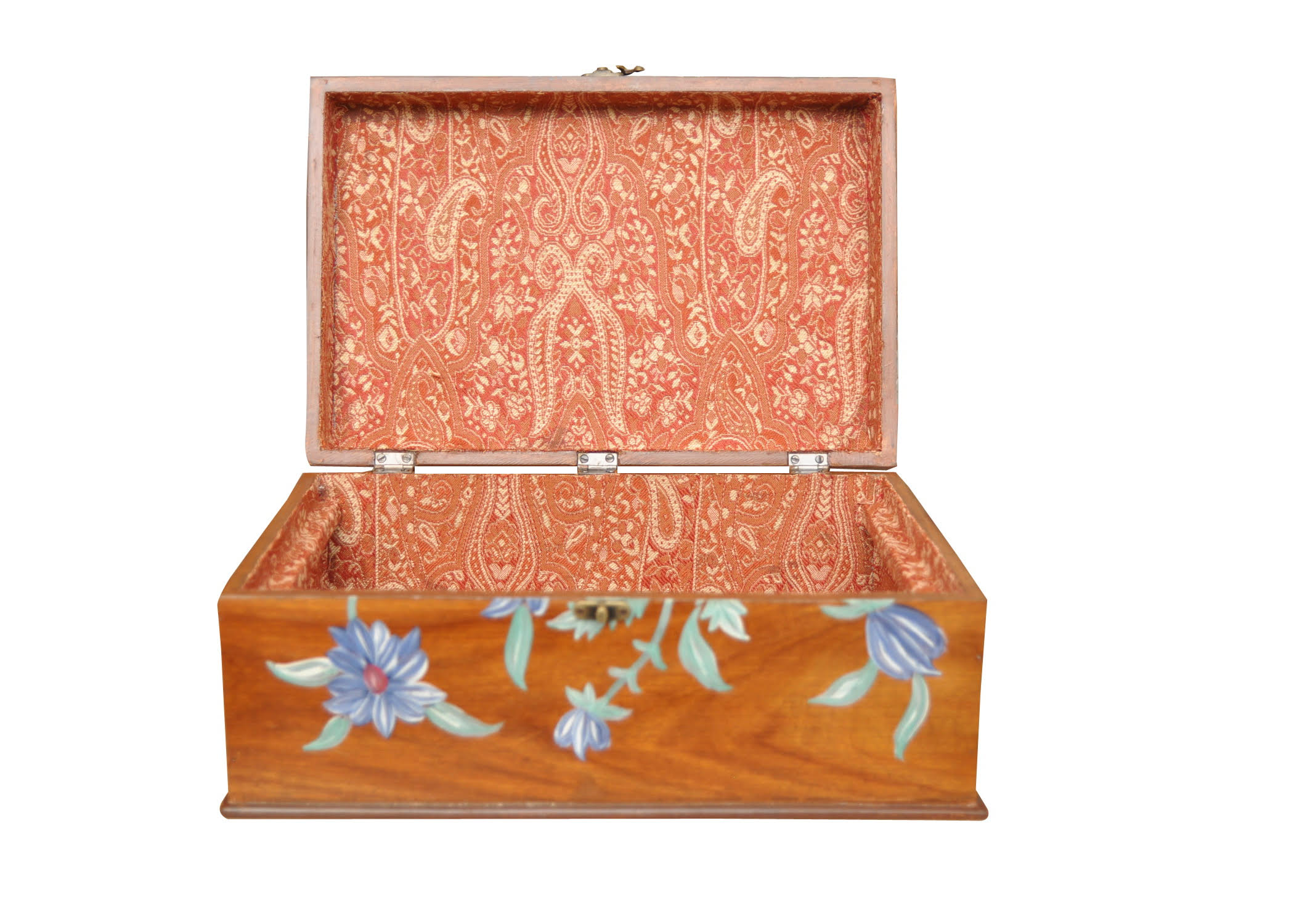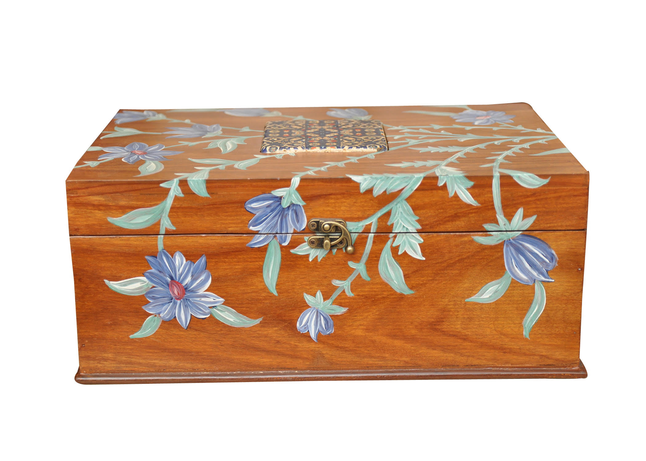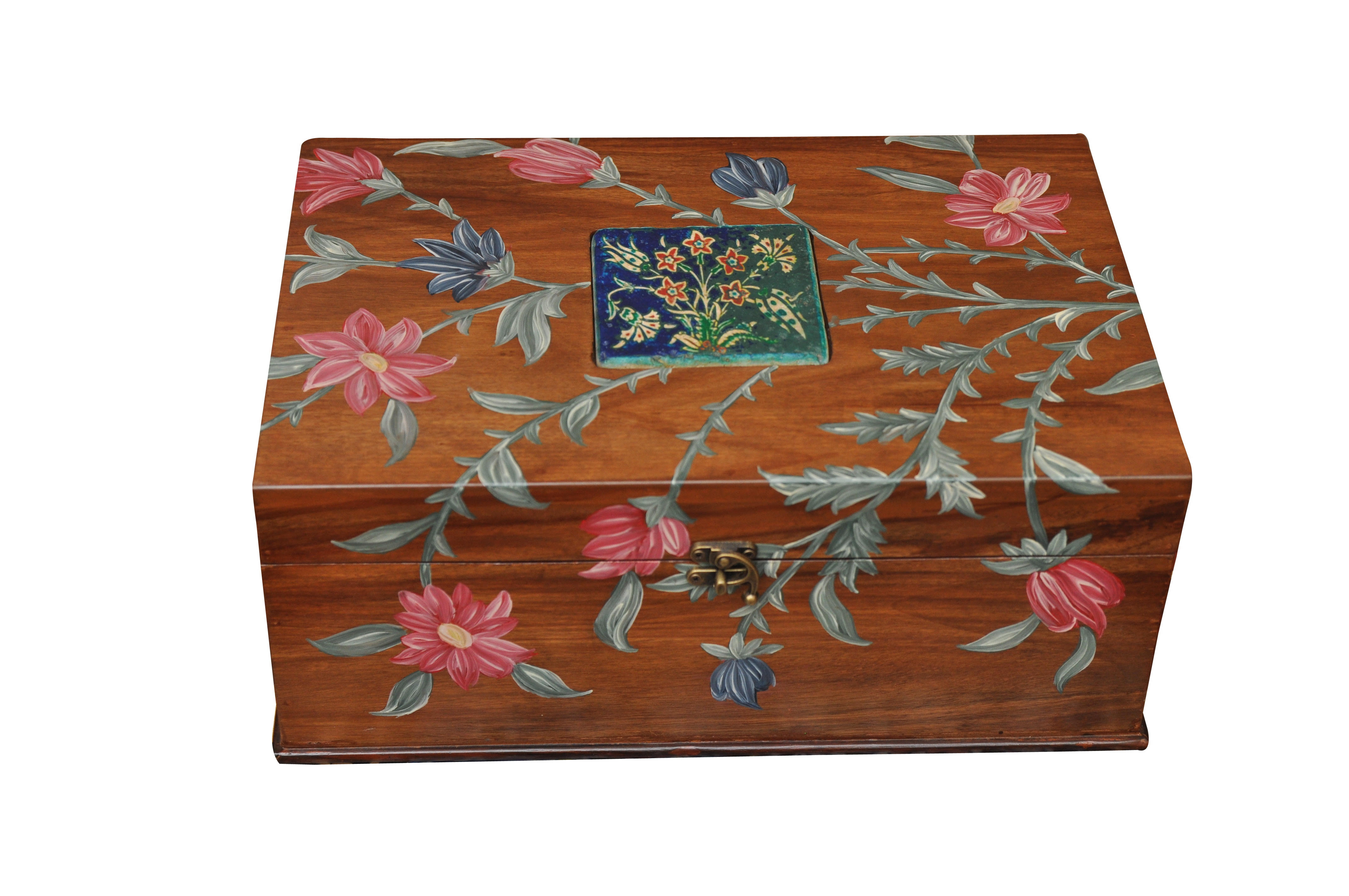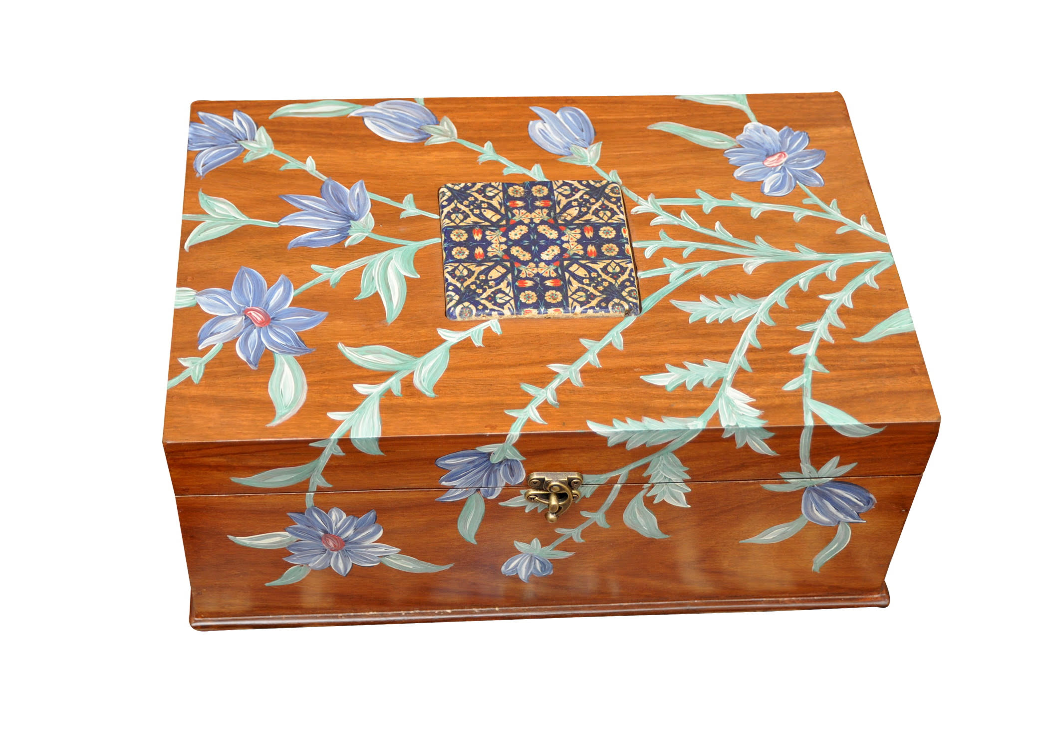 A well sized wooden jewellery box inspired by a 50 year old similar piece. The wooden is polished and beautifully hand painted to match the Turkish tile fitted in the Center of the lid at the top. Rs. 20,000/each