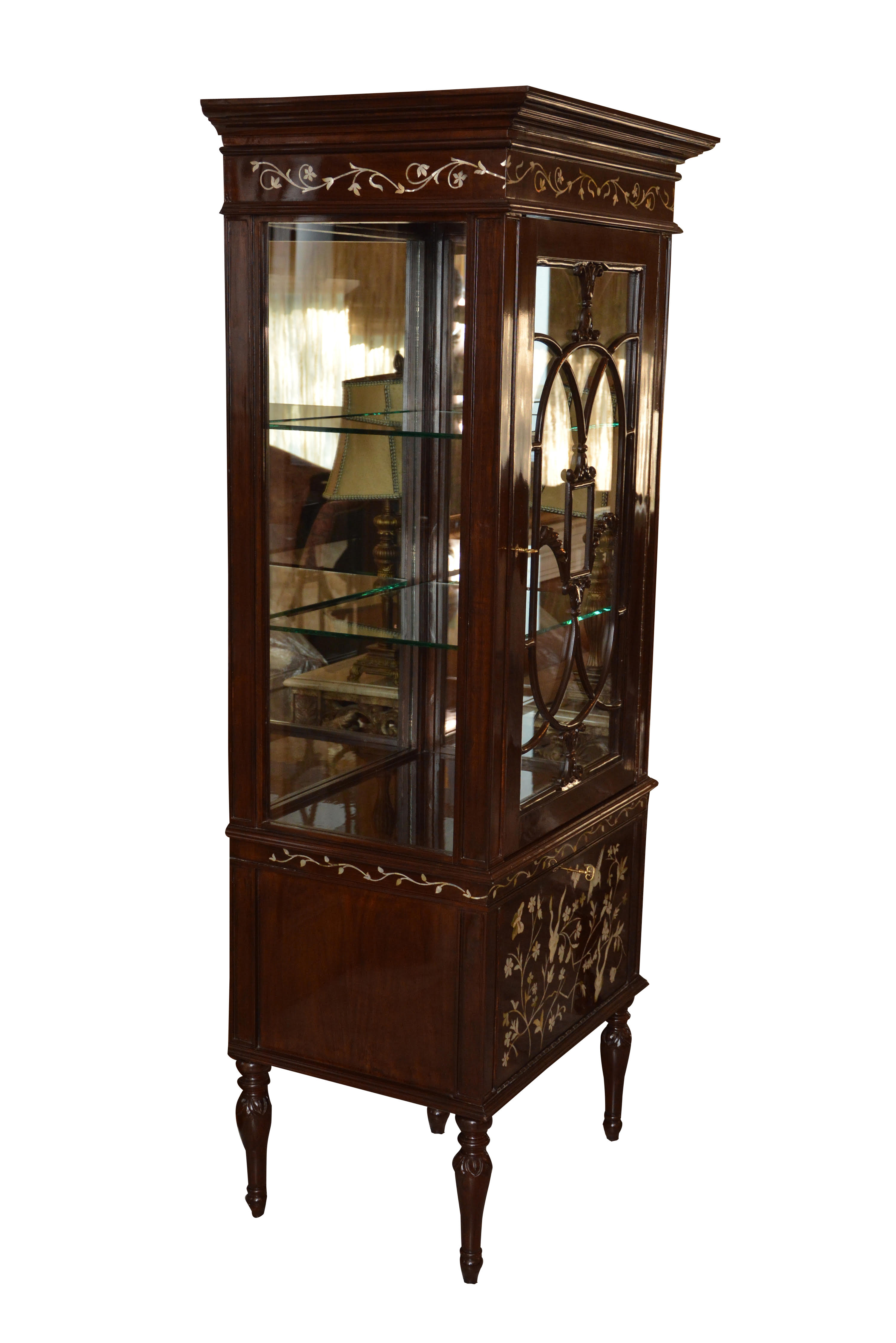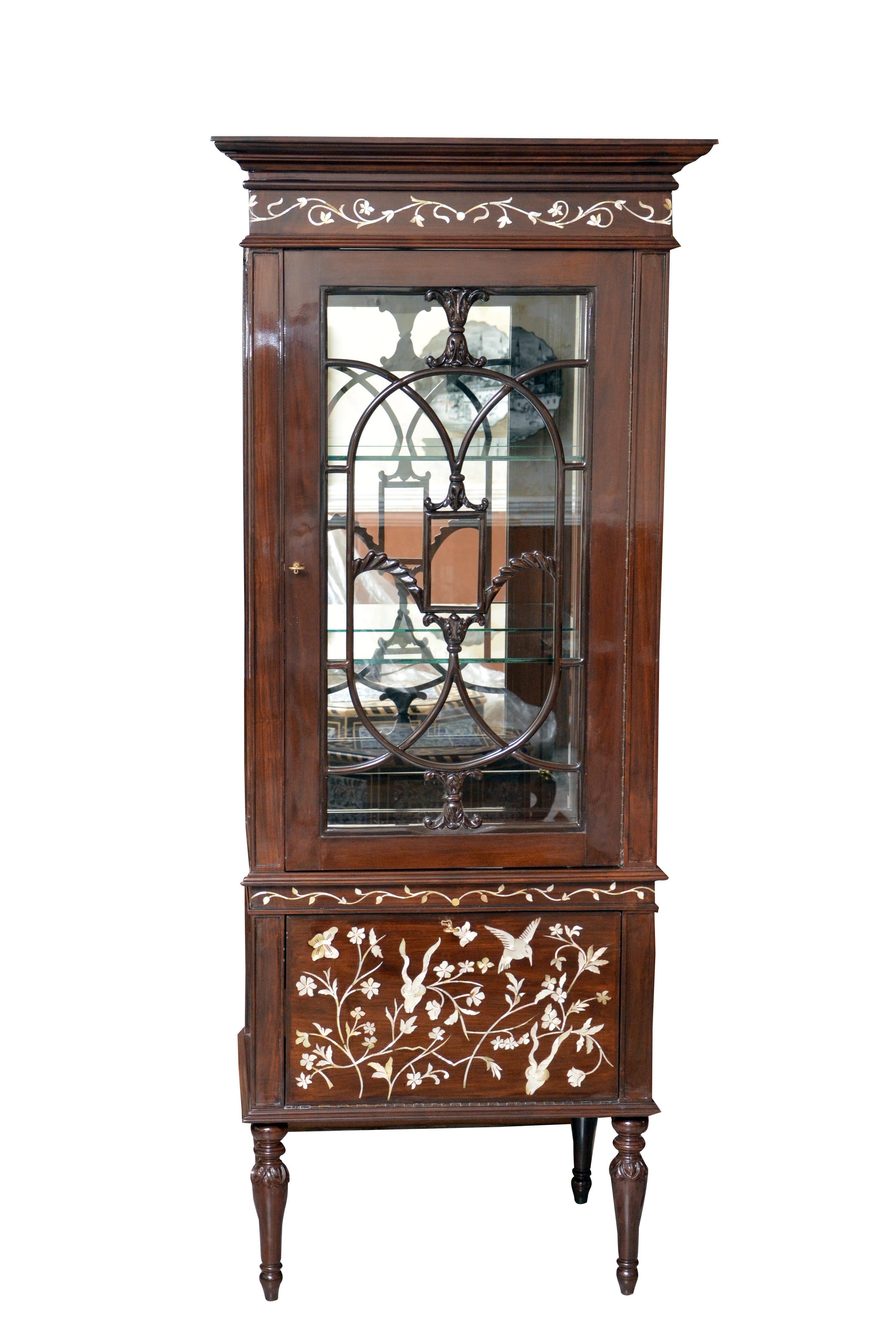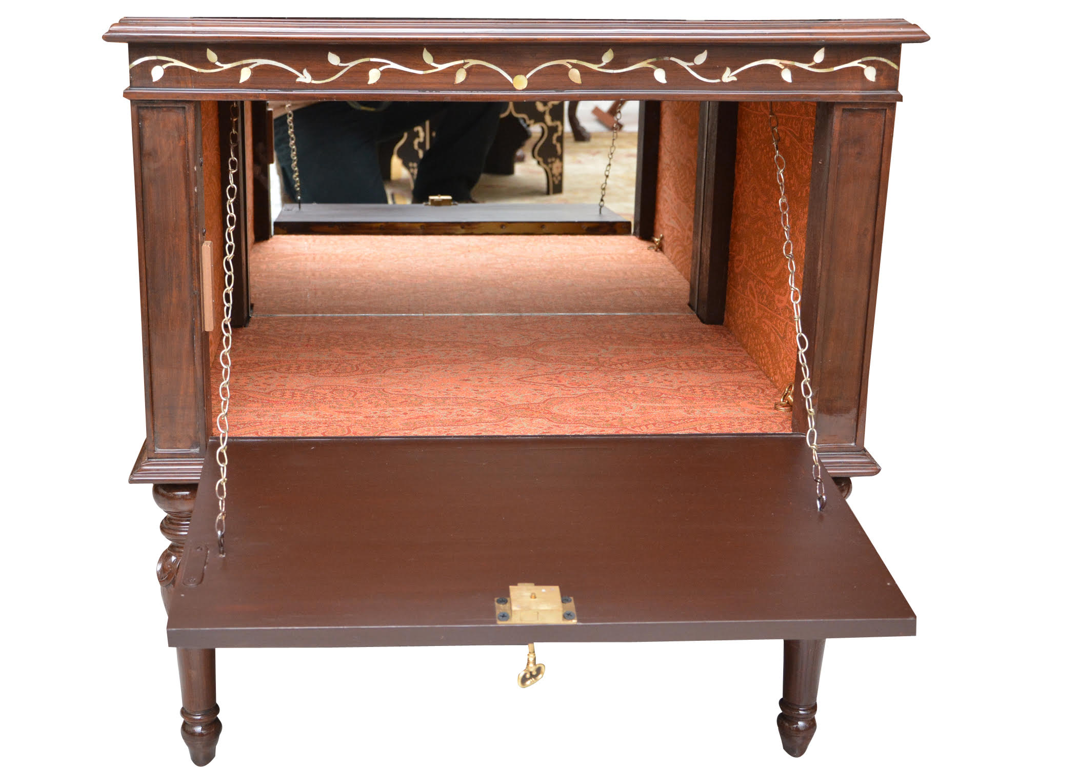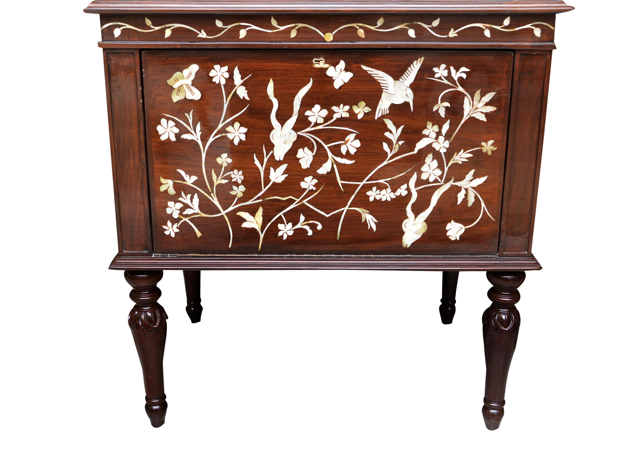 Decorative Cabinet: Mother of Pearl, glass, high gloss finished wood with grain showing prominently. Lock at the top and lock at the bottom in the mirror and jamavaar lined storage box as in picture. The inlay work of Mother of Pearl exhibits the beautiful markhor and a bird in the northern wilderness.