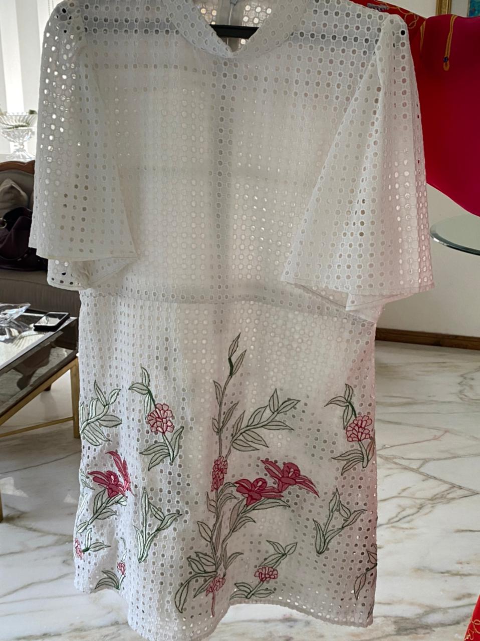 Description Chicken fabric dress style with machine embroidered lower part : free size