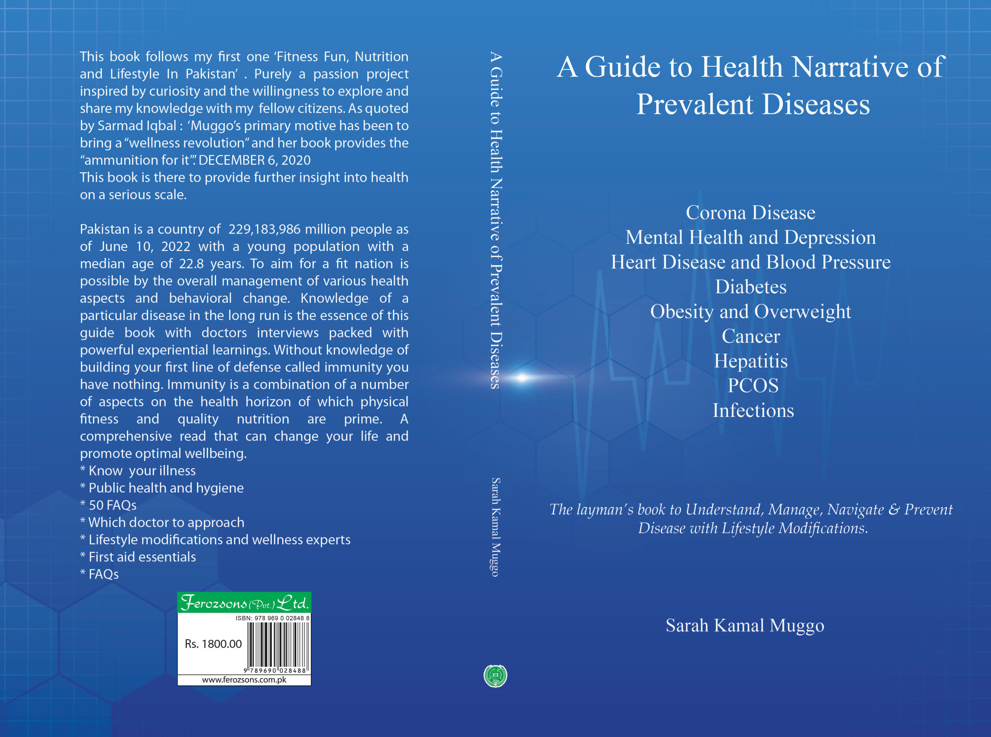 This book follows my first one Fitness Fun, Nutrition and Lifestyle In Pakistan' . Purely a passion project inspired by curiosity and the willingness to explore and share my knowledge with my fellow citizens. \n As quoted by Sarmad Iqbal: 'Muggo's primary motive has been to bring a "wellness revolution" and her book provides the "ammunition for it° DECEMBER 6, 2020 \n This book is there to provide further insight into health on a serious scale Pakistan is a country of 229,183,986 million people as of June 10, 2022 with a young population with a median age of 22.8 years. To aim for a fit nation is possible by the overall management of various health aspects and behavioral change. Knowledge of a particular disease in the long run is the essence of this book with Interviews packed with powerful experiential learnings. Without knowledge of building your first line of defense called immunity you have nothing. Immunity is a combination of a number of aspects on the health horizon of which physical fitness and quality nutrition are prime. A comprehensive read that can change your life and promote optimal wellbeing Know your illness * Public health and hygiene 50 FAQs